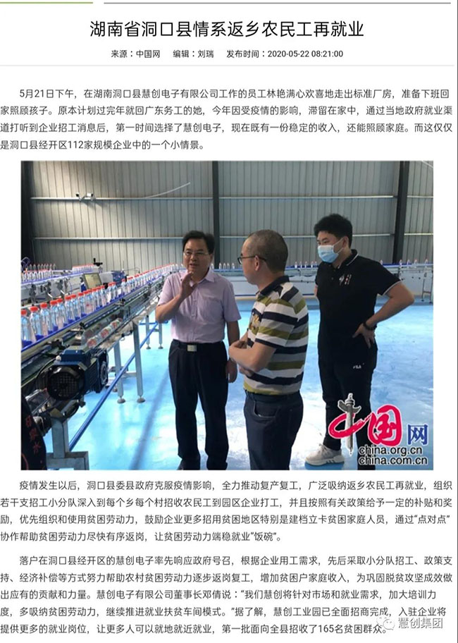 洞口慧创电子作为洞口县首批复工复产企业,通过加大招聘力度及贫困劳动力输入,为贫困劳动力提供就业岗位,大力推动贫困劳动力就近就地就业,并采取贫困劳动力就业补贴等措施,让更多的贫困劳动力在家门口早日实现就业,增加收入,确保脱贫。